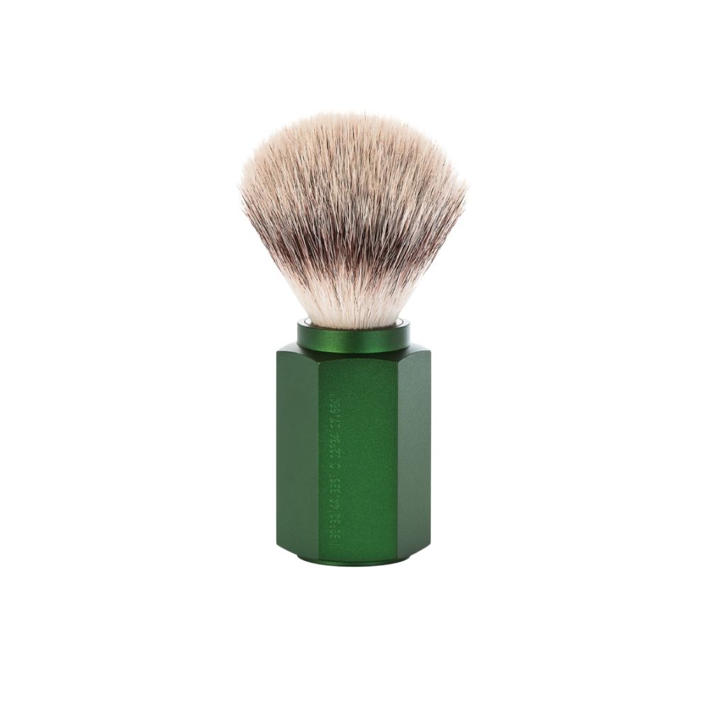 MÜHLE – HEXAGON Rasierpinsel mit Silberspitz Dachszupf, Farbe Forest
